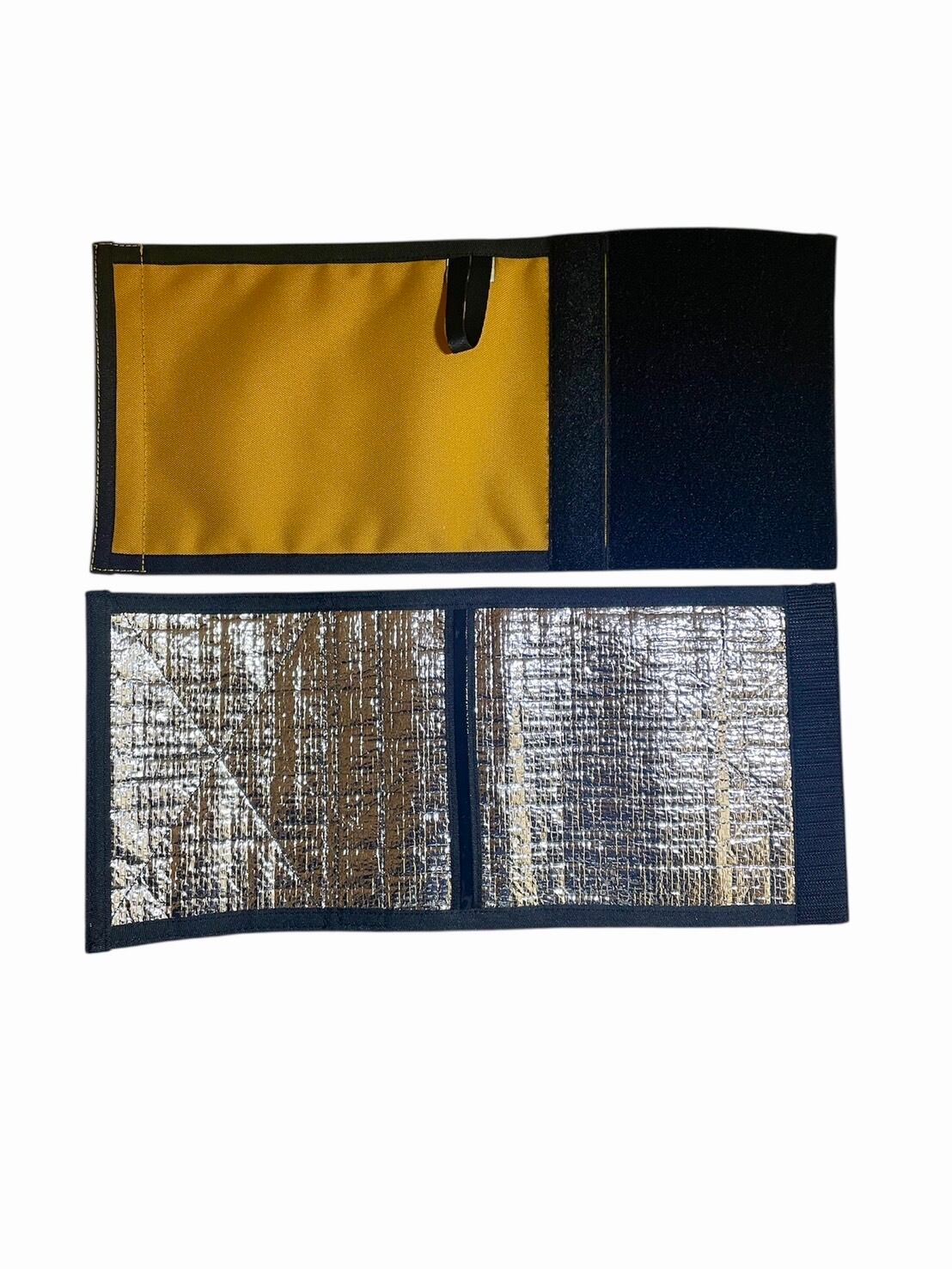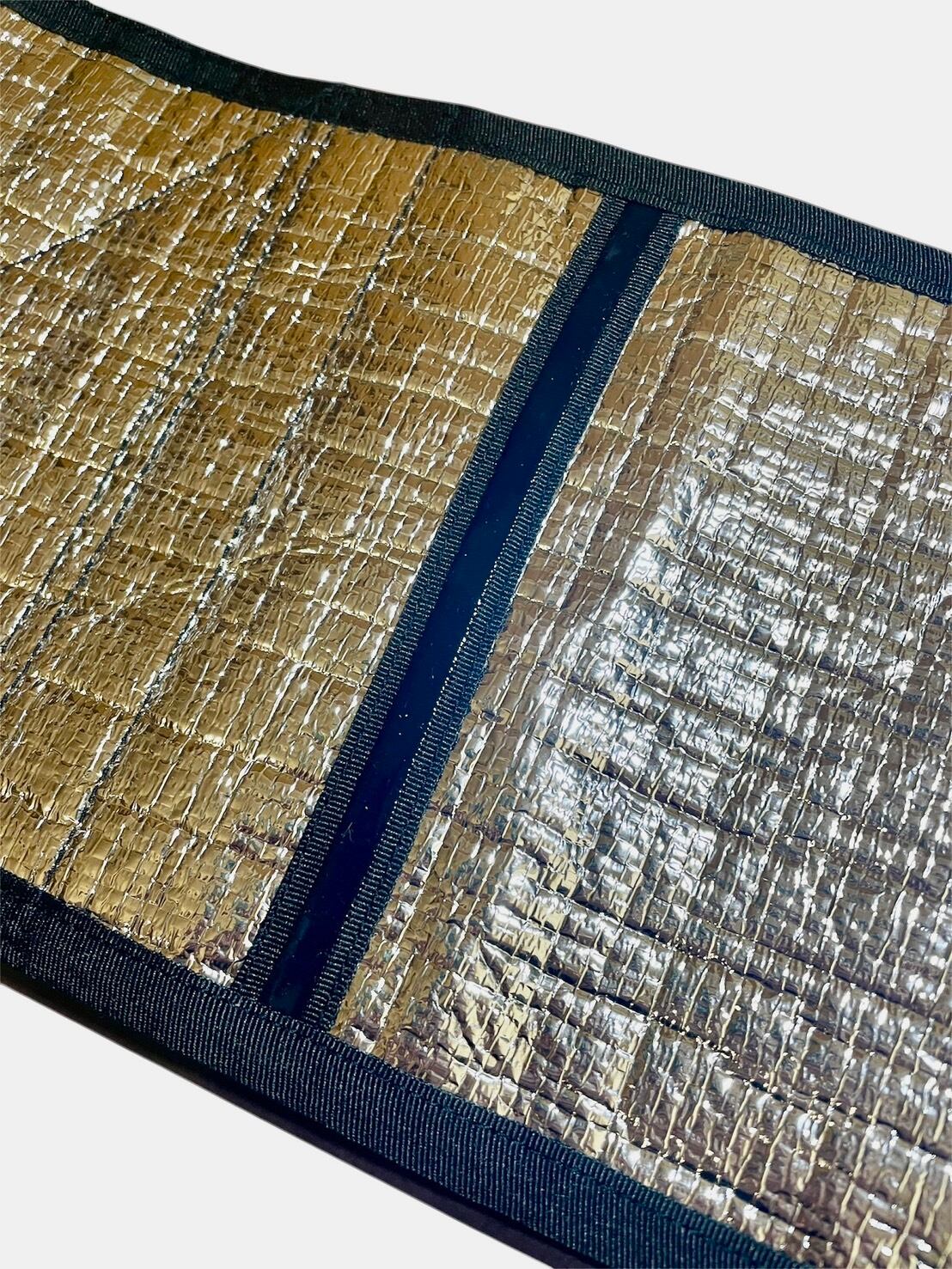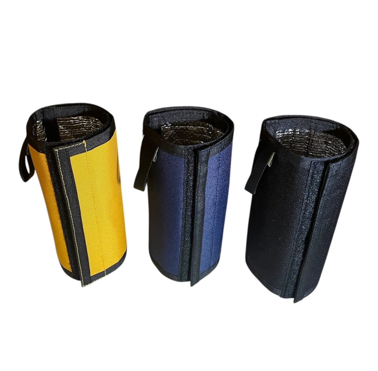 素材はコーデュラナイロンを使用し、裏地に1mm厚のアルミ蒸着のウレタンが付いています。加えて、ただ物を巻くだけで底面は抜けています。落ちるのを防ぐために内側にシリコンテープを付けており、ずり落ちをしづらくしています。