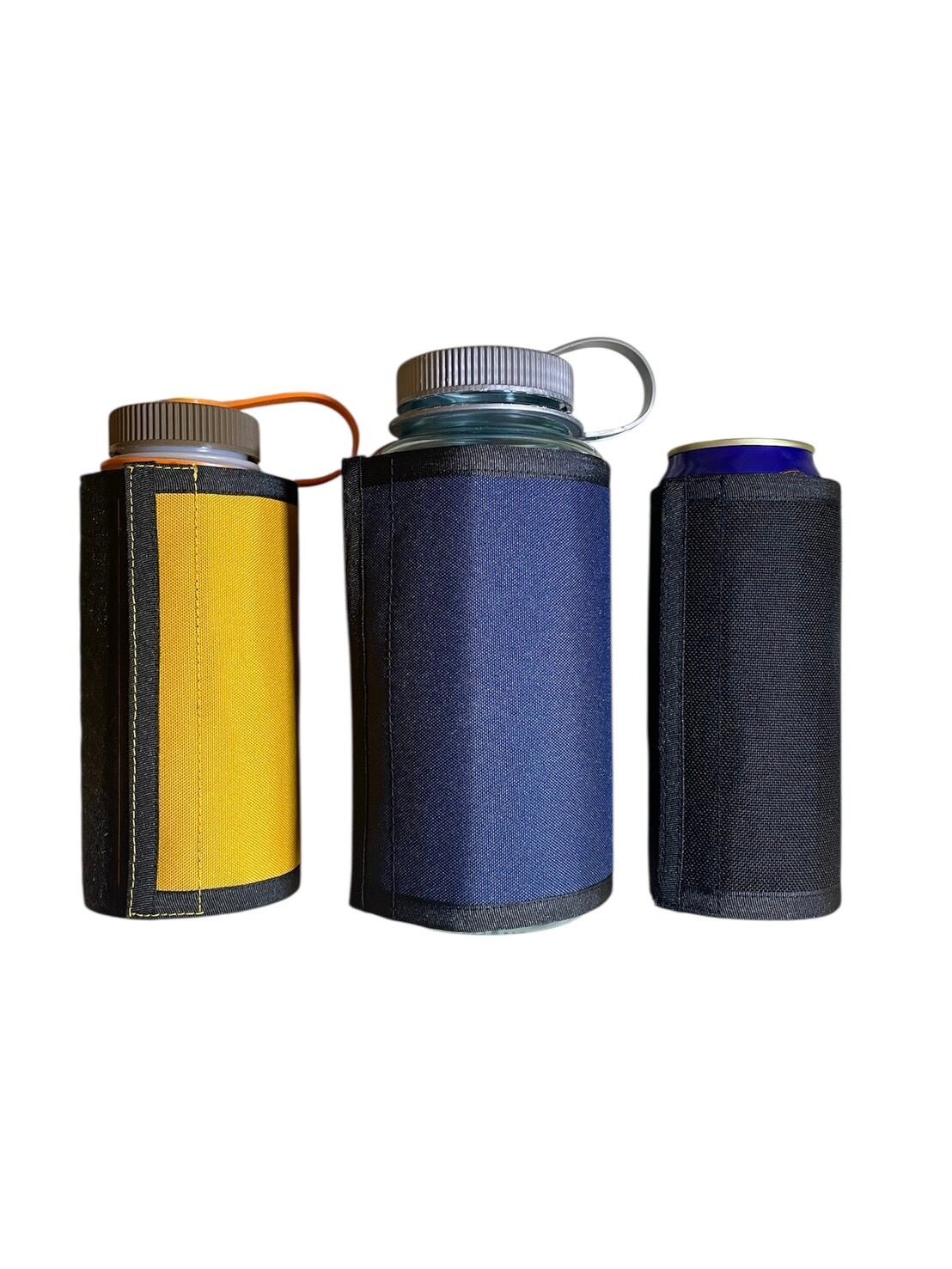サイズ感は、写真にある感じで、ナルゲンボトルから500ml缶まで対応に限界はあるものの、色々巻けます。
